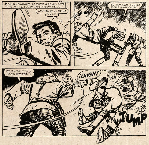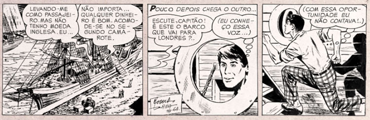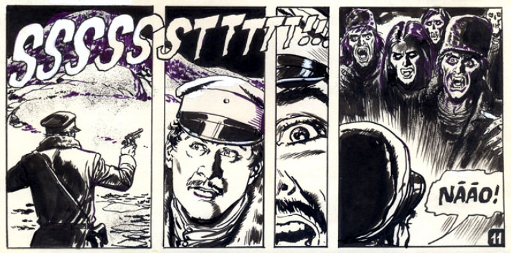 Due to the Argentinian publishing crisis in 1963, Zalla went to Brazil, where he initially worked through the Barbosa Lessa agency. He illustrated romance stories, as well as the daily 'Jacaré Mendonça' strip for the newspaper Última Hora. He then joined the publishing house Editore Taika, where he drew the Tarzanesque series 'Targo' and 'Escopião', a copy of Lee Falk's 'Phantom'. Zalla was one of the artists responsible for Escopião's modification, to avoid a claim from King Features Syndicate.