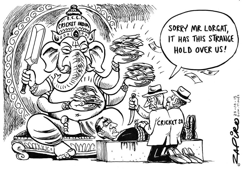 On 28 October 2013, Zapiro drew a cartoon depicting members of the South African cricket organization (CSA) trying to sacrifice their chief executive Haroon Lorgat to Ganesha, depicted with a Board of Control for Cricket in India sign on its turban and paying them money. The cartoon criticized how the Indian Cricket Board forced the South African cricket organization to sell Lorgat to them, despite their personal wealth. South African Hindu organizations like the Hindu Maha Sabha and Hindu Dharma Sabha demanded an apology. While Zapiro refused to apologize, he did emphasize it wasn't his intention to offend the Hindu community. He also explained that Ganesha is traditionally seen as a remover of obstacles.