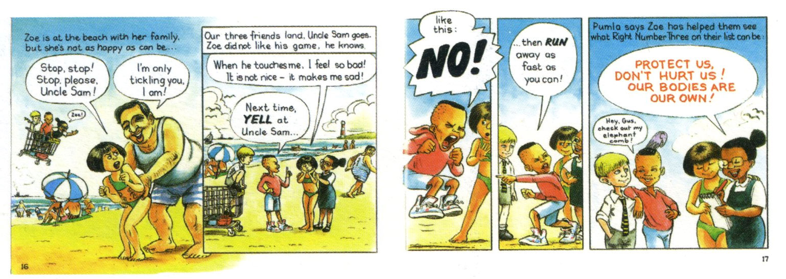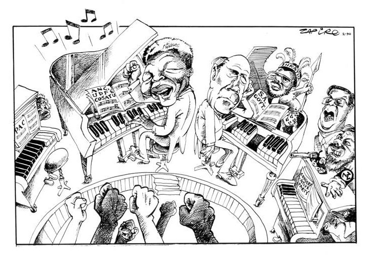 In 1991, Zapiro returned to South Africa, which had radically changed since his departure three years earlier. A new President, F.W. de Klerk, had liberated Nelson Mandela in 1990 and legalized his party ANC. The United Democratic Front therefore disbanded, absolving itself into the ANC. In 1993, apartheid was abolished and the first democratic elections in the country became possible. A year later, Nelson Mandela was elected President. While some feared that racial tensions and violence might escalate, Mandela's charisma managed to smoothen the transition from apartheid-torn South Africa to the new "rainbow nation". Zapiro was very excited about all these developments. He designed posters for the first democratic elections and met Mandela a couple of times throughout his career. However, between 1991 and 1994, Zapiro didn't really know how to draw political cartoons about his rapidly changing country. Instead, he focused on making educational (photo) comics, like the AIDS education book 'Roxy: Life, Love and Sex in the Nineties' (1992), a child abuse prevention work, 'A Trolley Full of Rights' (1993), and a guide on democracy, 'Tomorrow People' (1994). All books were published by the Story Circle, an imprint co-founded by Zapiro. 'A Trolley Full of Rights' was also later used by UNICEF and distributed in other African countries.