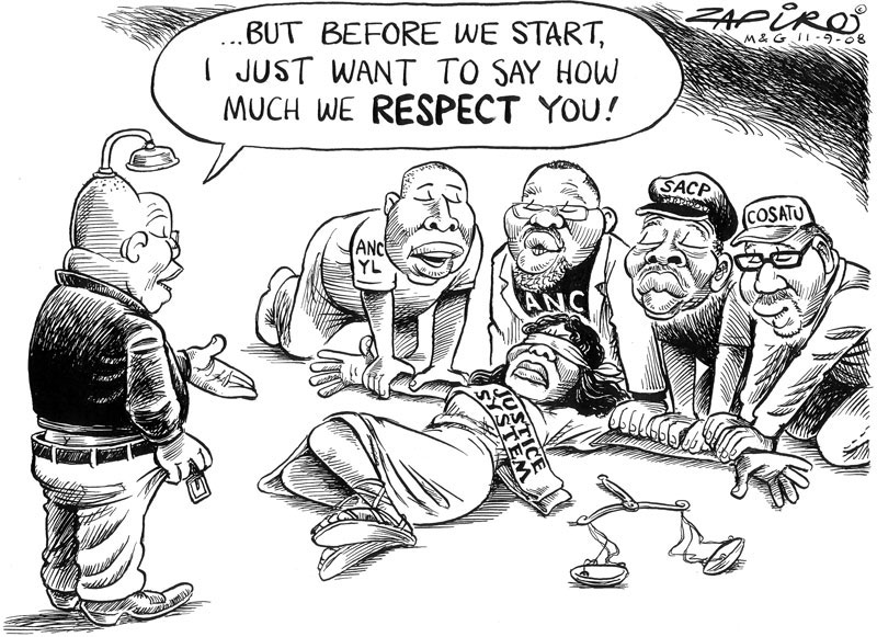 On 8 September 2008, Zuma was acquitted. The next day, Zapiro drew a cartoon for the Sunday Times, in which Zuma prepares to rape Lady Justice, while the ANC secretary-general Gwede Mantashe, the ANC Youth League leader Julius Malema, the South African Communist Party leader Blade Nzimande and the COSATU (Congress of South African Trade Unions) president Zwelinzima Vavi hold her down. The drawing sparked enormous controversy, especially among Zuma supporters. A few days later, Zuma and Mantashe issued statements that they respected the judicial system. This prompted Zapiro to redraw the cartoon, depicting Zuma and his cronies assuring their rape victim: "But before we start, I just want to say how much we respect you!". Both the paper and Zapiro were sued by the ANC, the ANC Youth League and, for the third time, by Zuma. The scandalous cartoon received attention nationally and abroad. In late 2012, a day before the Zuma vs. Zapiro case was heard in court, Zuma unexpectedly dropped his lawsuit about the 'Rape of Lady Justice' cartoon. In May 2013, he dropped the others too.