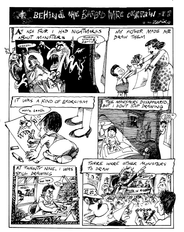 Once free again in August, Zapiro instantly left for the United States, studying media arts at the School of Visual Arts in New York, particularly because he had heard that Art Spiegelman taught there. But much to his disappointment, Spiegelman hadn't taught in the school for about a year. The South African foreign student was still excited to receive lessons from other distinguished comic veterans like Will Eisner and Harvey Kurtzman. Through the school's principal, Zapiro was eventually able to receive an independent training by Spiegelman for a semester. He learned a lot about visualizing ideas on an accessible level, to properly communicate with readers.