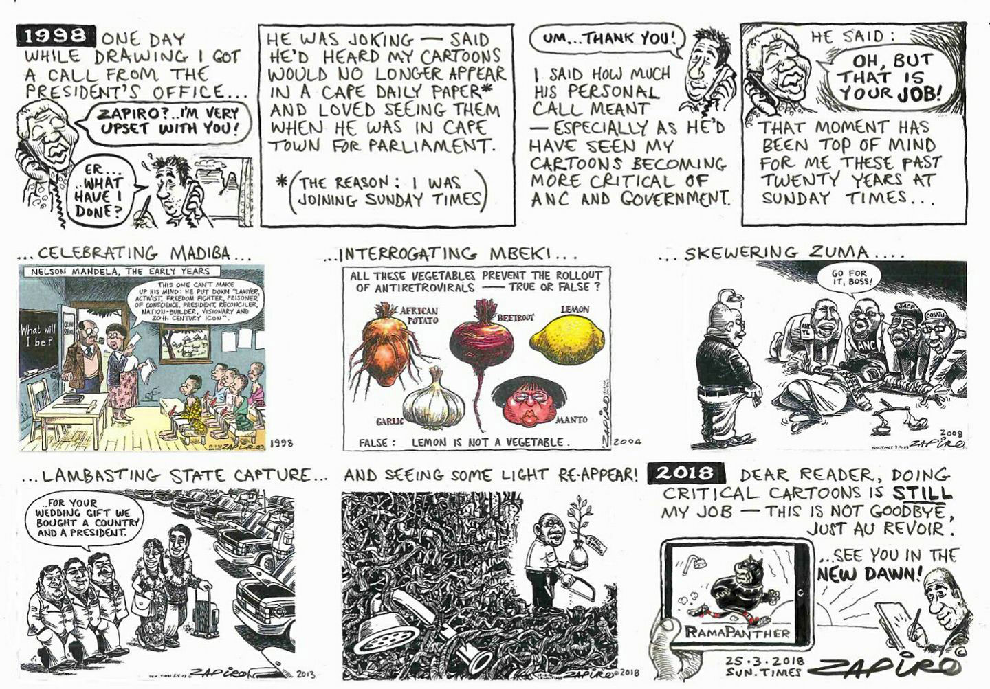 Eventually, Zapiro felt he had a better grasp of the "new" South Africa and took up political cartooning again. Between February 1994 and 2017, he returned to his former position as editorial cartoonist for the Mail & Guardian, succeeding Derek Bauer, and Die Suid-Afrikaan. In July 1994, heHe also joined the magazine Sowetan in July of that same year, succeeding Len Sak. Between 1996 and 1998, his cartoons could also be seen in Cape Argus. When he left this publication, he received a personal phone call from President Nelson Mandela, who expressed his disappointment that he could no longer follow Zapiro's cartoons in his favorite paper. Between 1998 and March 2018, Zapiro was a mainstay in the Sunday Times, and since May 2009 also in The Times. After leaving the Sowetan in 2005, Zapiro drew cartoons for the Pretoria News until 2008. His work has also appeared in the Cape Ties, Pretoria News, The Star and The Mercury. Since 2017, he is the house cartoonist of The Daily Maverick.