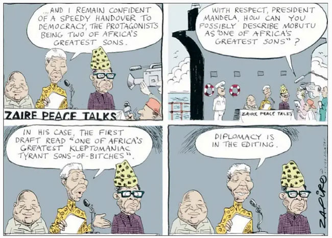 Political comic strip for Sowetan, 6 May 1997, depicting Laurent Kabila, Nelson Mandela and Mobutu Seko Seko.