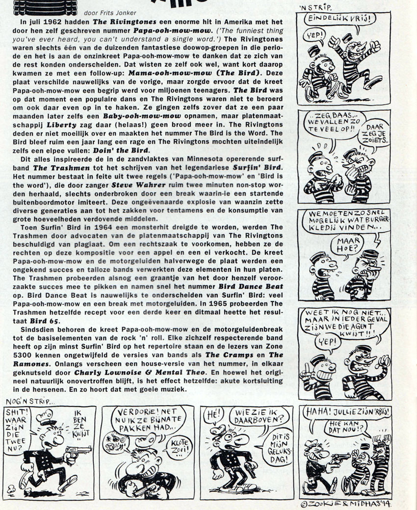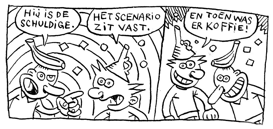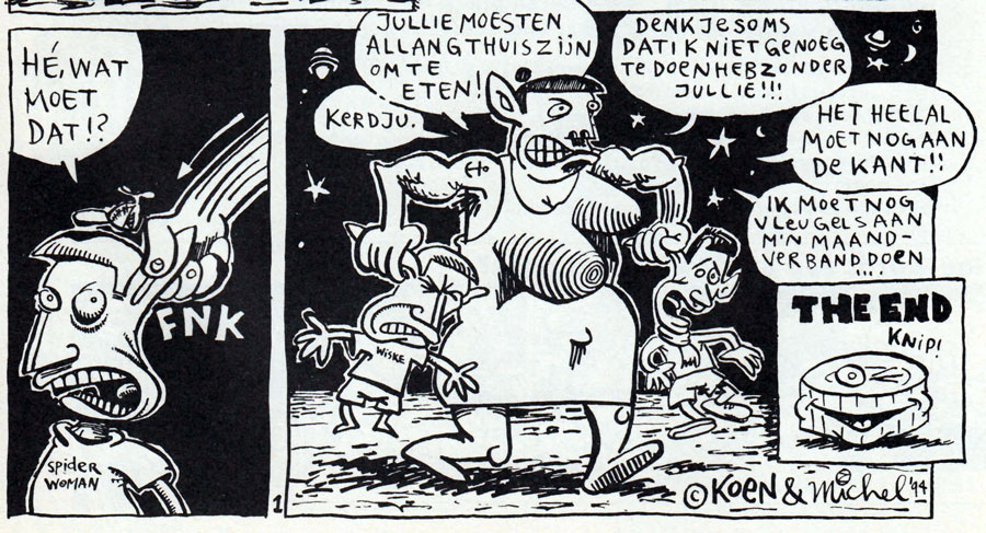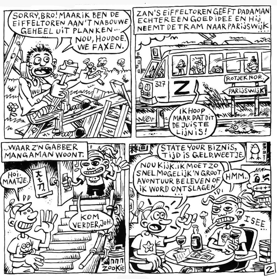 During the 1990s and early 2000s, Zookie's "nonsense strips" also appeared in other Dutch small press magazines. Through Robert van der Kroft, he was already present in the first issue of Zone 5300, the pop-cultural comic magazine from Rotterdam. For the early issues, he made so-called "corner strips": two gag strips - one vertical and one horizontal - that end in the same panel in the bottom-right corner. Throughout the decade, Zookie continued to contribute his absurd humor strips to Zone 5300. In addition, his strips appeared in Wartaal, Insanity, Chaos, Incognito, Impuls and Sputnick, as well as Jeroen Steehouwer's 'Hildebrand Comix Lowlands' (2003)and the Groningen comic magazine Gr'nn. Recurring characters in Zookie's strips were 'Spock & Spocky' and 'Doctor Feelnoshame' - both co-created with Koen Delaere - as well as 'Eikeltje', 'Zan' and his personal favorite, 'Dadaman'.