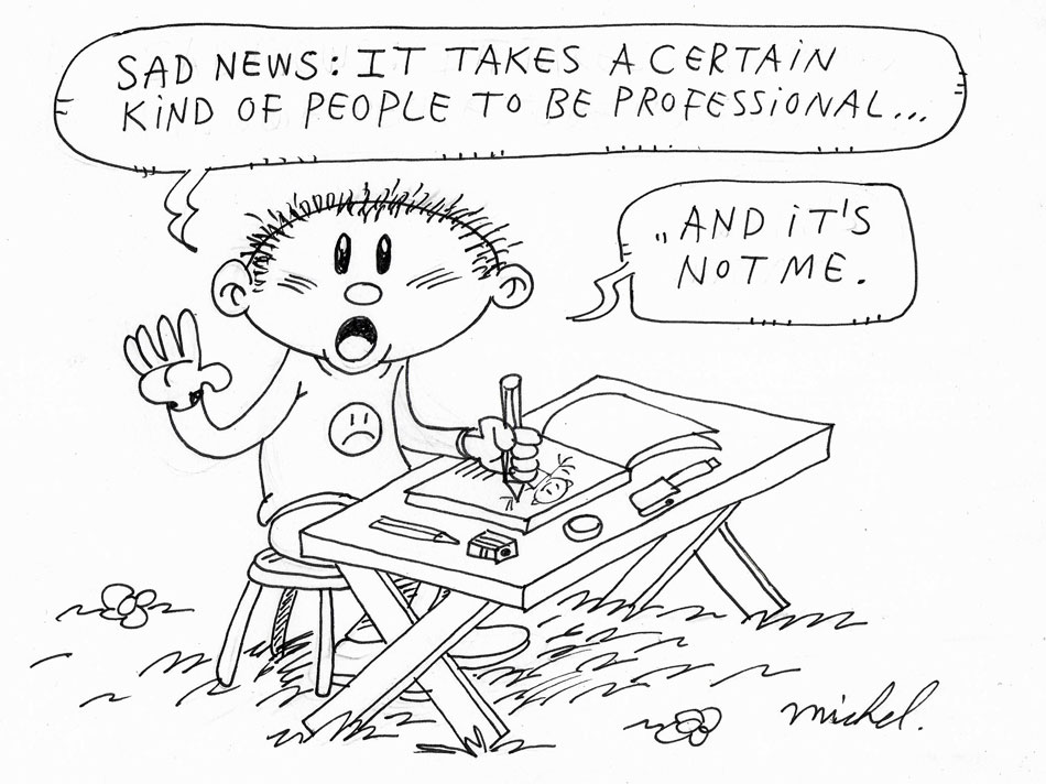 Around 2003, Michel den Hamer had grown tired of the Dutch comics scene. Dropping his Zookie moniker, he turned to making paintings and fan art, mostly signing with only his first name. After sending some of his fan art to Spirou magazine in Belgium, he was surprised to discover that the magazine actually printed some of them. In addition, new comics and cartoons appeared on the Stripster.nl portal, including the gag strip 'De Kwajongens' and some co-productions with scriptwriter Niquicho. In 2013, these Den Hamer-Niquicho strips were collected in the book 'Over Mensen en Monsters' by the Belgian publishing imprint of Peter Bonte. In 2021, that same publisher also released a collection with his solo comics under the title 'Michel den Hamer, Voorheen Zookie'.