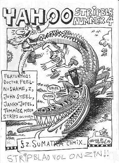 During a period of ten years, "Zookie" was a regular presence in the Dutch small press comics scene, first with his own DIY Zookie-krant, and then with his own chaotic Yahoo! fanzine. Between 1993 and 2003, several issues were released under the cartoonist's own imprint FZ Sumatra. After a while, Zookie became active in mail art, an alternative art movement where artists exchange artwork and fanzines internationally. Distributing his title Yahoo! and his later fanzine Zen this way, he got in touch with other comic creators from The Netherlands, Belgium, France, Italy, Japan and the USA. This resulted in collaborations with other fanzines, an Italian collection of his comic strips and participation in an exposition in Japan. Through his new contact, he expanded Yahoo! with longer stories, articles and contributions by others, such as Mark van den Anker, Luuk Bode, Mars Gremmen, Maaike Hartjes, Floris Oudshoorn, Marcel Ruijters, Trick and ckoe.