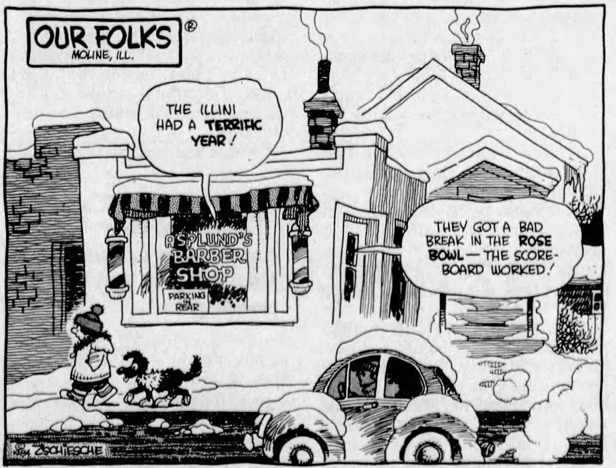 Zschiesche returned to editorial cartooning, depicting ordinary citizens and their daily concerns against local landmarks like Victorian houses, gravel driveways, the backs of pickup trucks and courthouse steps. He named the panel 'Our Folks' (1980) and syndicated it himself to about 38 local newspapers. The project didn't last long, and the artist retired to the family farm near Prophetstown, Illinois. In addition, Zschiesche developed a daily comic strip with anthropomorphic farm animals called 'Harley Hogg', which appeared in some local newspapers from the Midwest. He also picked up painting, but decided his real love was cartooning.