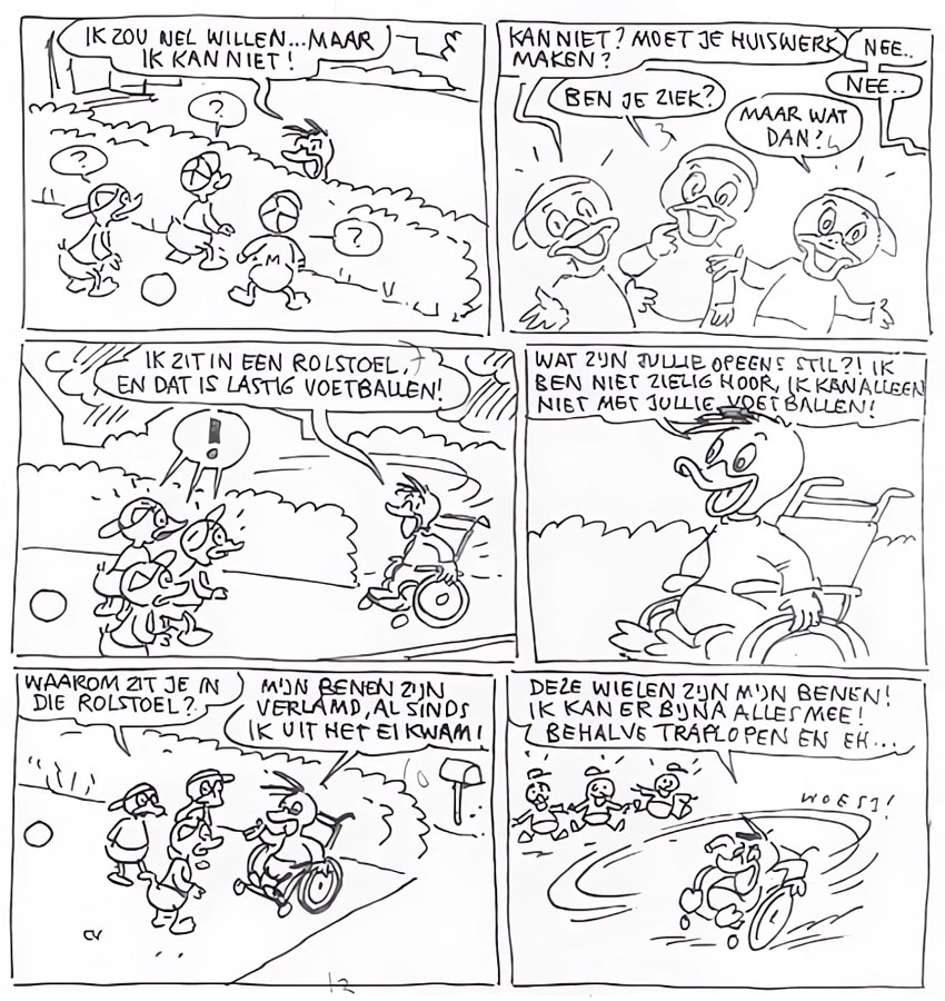 Between 1996 and 2020, Sieger Zuidersma was also a frequent scriptwriter for the Dutch Donald Duck weekly, first working for chief editor Thom Roep and then through Jos Beekman. Creating gag strips, short stories and an occasional longer adventure, Zuidersma has tackled many of the Disney characters. Besides the Duck family, he also scripted stories with the Big Bad Wolf, Br'er Rabbit, Mickey Mouse & Goofy and Hiawatha. A notable contribution by Sieger Zuidersma to the Dutch Disney universe is the character of Rik, a boy in a wheelchair, who becomes friends with Huey, Dewey and Louie. First appearing in Donald Duck #7 of 2016, the character was welcomed with much acclaim, and has appeared in many stories since, several of which written by Zuidersma.