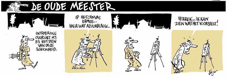 Perhaps Zuidersma's most personal creation is 'De Oude Meester', a comic strip about a painter. Inspired largely by his father, the strips are mostly funny, sometimes reflective, but always recognizable for people active in the arts. Between 1994 and 2001, the 'Oude Meester' strips ran in the local art magazine Kunstkrant. Between 1998 and 2008, new episodes appeared in the irregularly appearing regional comic magazine GR'NN, edited by Edmond Spierts (Vlerk). Since the death of his father in 2014, Sieger Zuidersma has put the series on hold, although some previously unpublished episodes appeared in Galeriekrant in the period 2016-2019.
