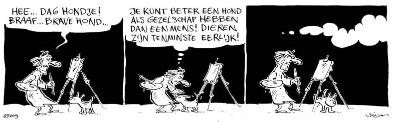 'De Oude Meester'. Translation: "Hey, hello doggie! Nice... nice dog. You can better have a dog as a companion than a human. Animals at least are honest."