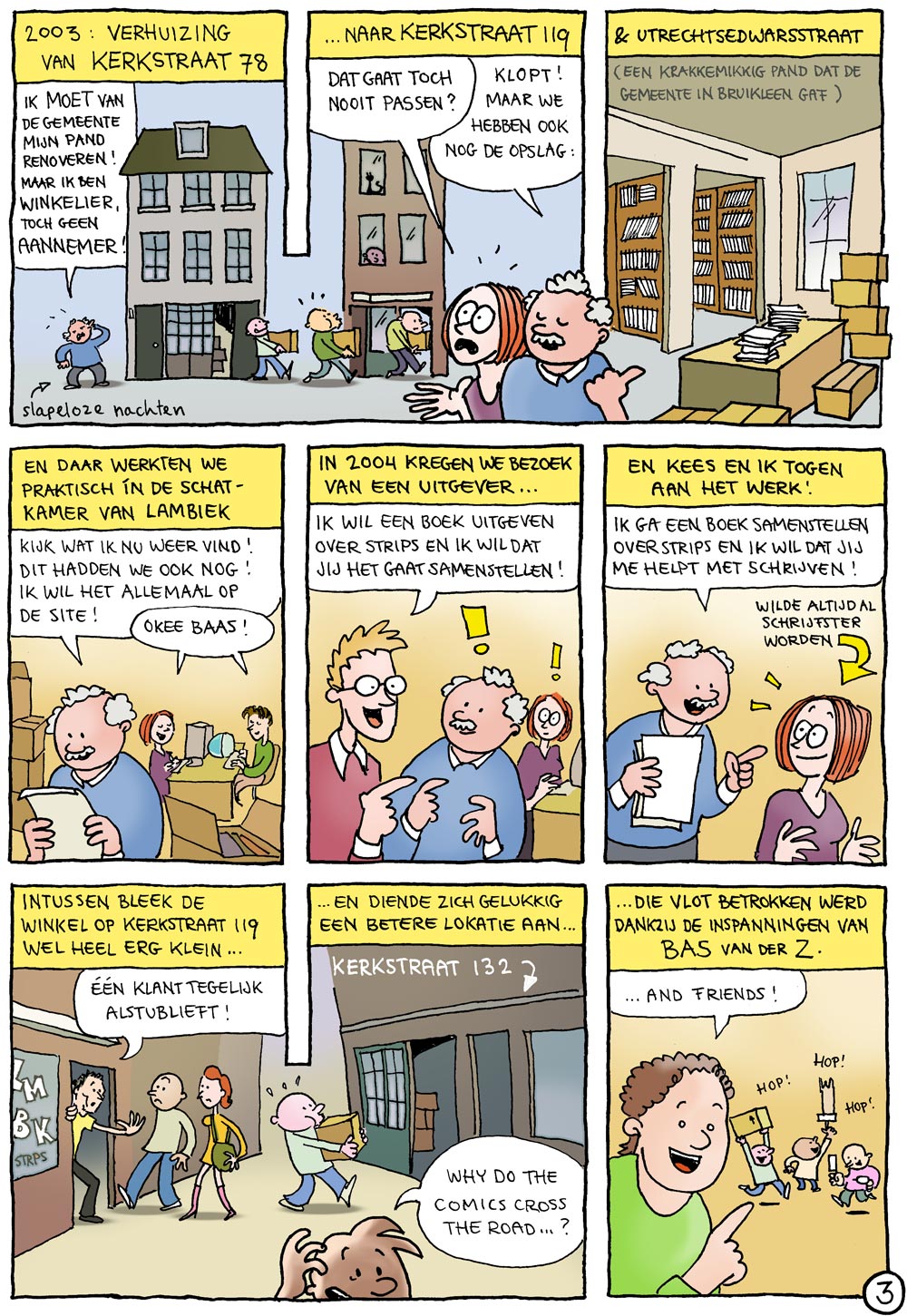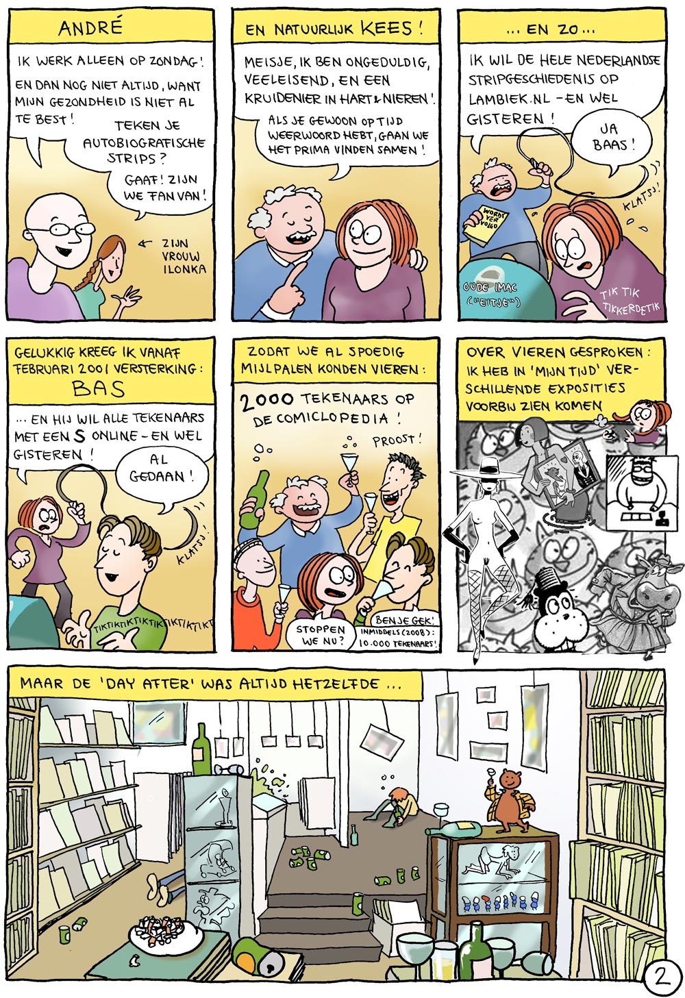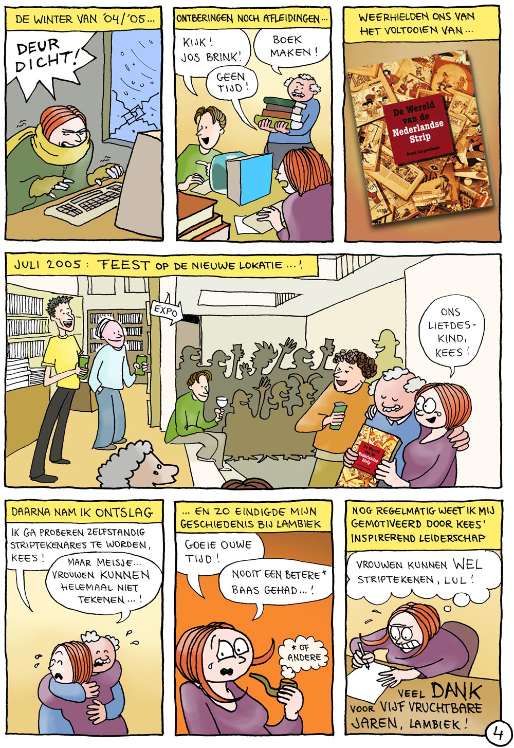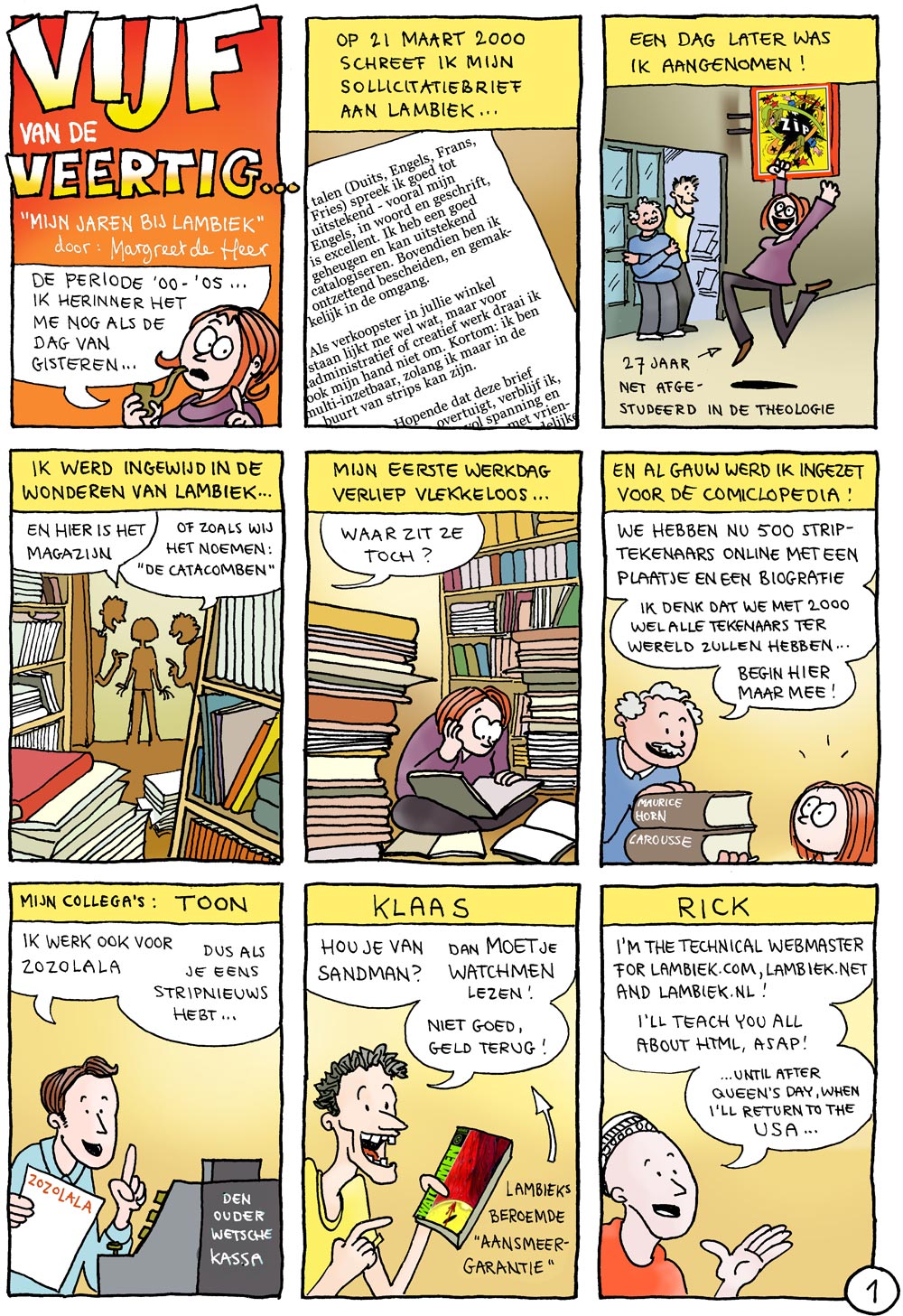 Striptekenaar Margreet de Heer, Lambiek-medewerkster van 2000 tot 2005, maakte ter gelegenheid van ons veertig-jarig bestaan deze strip over haar tijd bij Lambiek. In 2018 kleurde ze hem voor onze vijftigste verjaardag ook nog eens in!