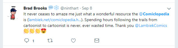 With new sources available, and each entry leading us to a web of related artists, it became impossible for us to stop after the planned 3.000 entries. It was a shame that so many cartoonists remained unknown, unrecognized, belittled or forgotten. A good number of them were accomplished graphic artists and writers outside their comics career. Novelists, advertisers, political parties, humanitarian organisations, rock bands considered these comic artists talented enough to create material for them, but to the general public, those who worked producing comics were people without a "real job". Art critics didn't consider their work capable of any depth, simply because of the medium they worked in. Only a select few of the the total number of comic artists have ever enjoyed great fame or success, and there are many reasons why these cartoonists slipped away from the public's consciousness. Some had only been published in one obscure magazine, others were only phenomena in their own country and were never translated. Many were associated with one particular signature comic, while their other work remained largely overlooked. More than a few combined their syndicated comic strip with a more lucrative nine-to-five job to make ends meet. Some were forced to quit because they couldn't keep up the pace, or because editors cancelled their comic. Others kept going for decades, but were rarely decently paid. Some cartoonists were pigeonholed because they made "infantile" children's comics, "violent" action comics or "vulgar" erotic cartoons. Others were "just an assistant" to a more well-known original creator. While certain comic artists have remained in the mind of today's public, thousands of others sank into obscurity once they no longer appeared in syndication. The Comiclopedia team felt it was their mission to save these cartoonists from oblivion.