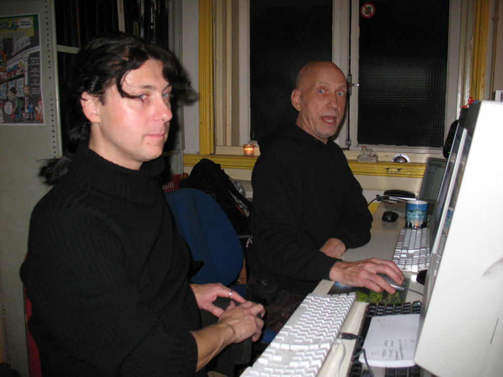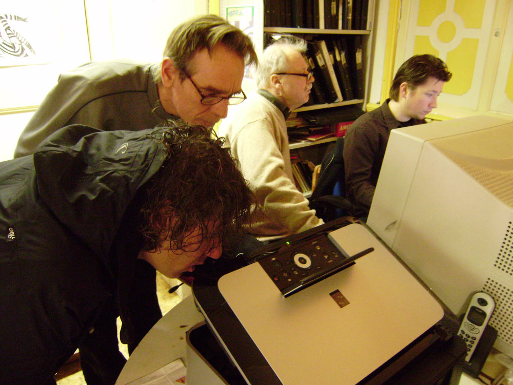 Bas and Kees working on the Comiclopedia, while Boris and Klaas are inspecting the new printer (2009).