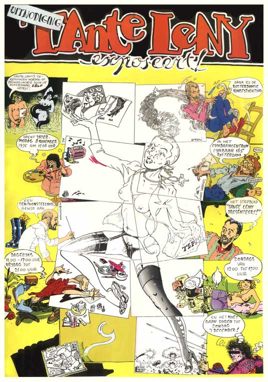 Many Dutch comic artists were inspired by these American comix and started their own "underground" magazines. In 1972 the first issue of Tante Leny Presenteert appeared, featuring work of Dutch artists like Evert GeradtsArmand StijnenHarry BuckinxWillem Egbert Bodewes(Bill), Aart ClerkxPeter PontiacJoost Swarte and Marc Smeets, as well as the Belgian Ever Meulen and the Spaniard Mariscal.