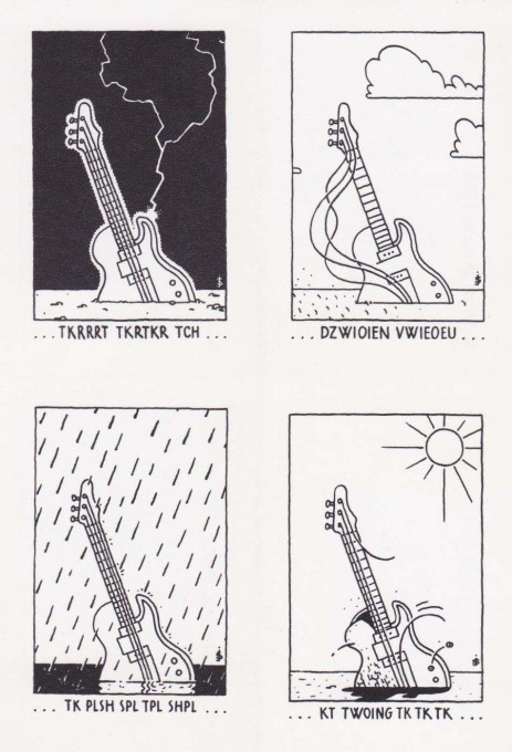 Bij elke bestelling uit onze webwinkel ontvangt u gratis een gitaarprentje van Joost Swarte. Er zijn vier verschillende ontwerpen. Verzamel ze alle vier!