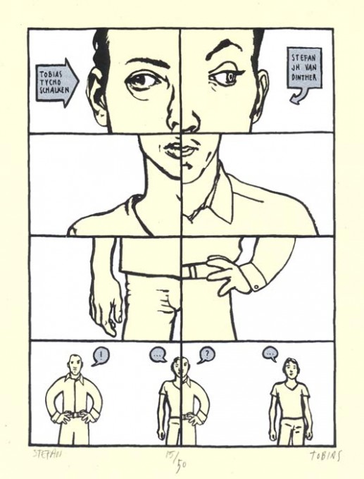 Vanaf 26 januari 2001 exposeren de toonaangevende jonge Nederlandse stripmakers annex beeldend kunstenaars Stefan van Dinther en Tobias Schalken in Galerie Lambiek.