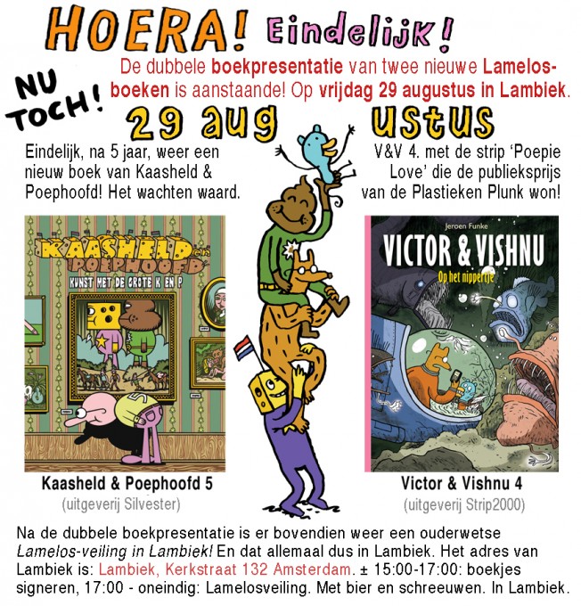 Op vrijdag 29 augustus, vanaf 15,00 uur is het weer feest bij Lambiek! Eerst een dubbele boekpresentatie van het nieuwe album van Kaasheld & Poephoofd en Victor & Vishnu, daarna de traditionele Lamelos veiling!