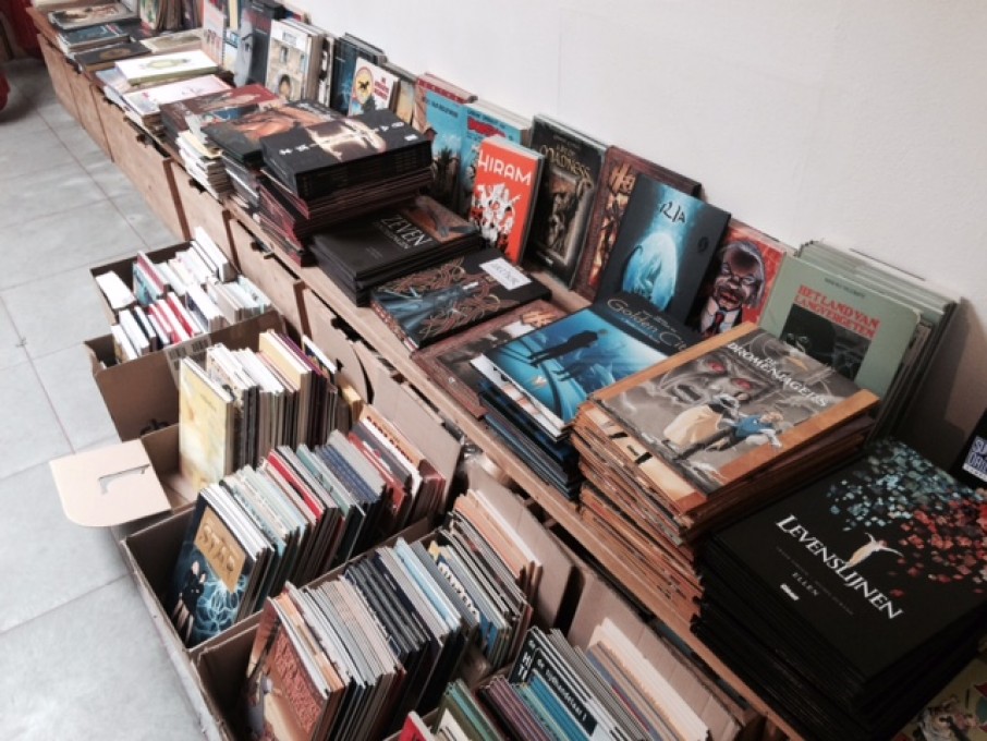 Verder liggen er nog tallozen andere strips, comics en graphic novels, allemaal met 50% korting. In de winkel staat een tafel met Franstalige strips, die mogen ook allemaal weg voor de helft van de prijs.