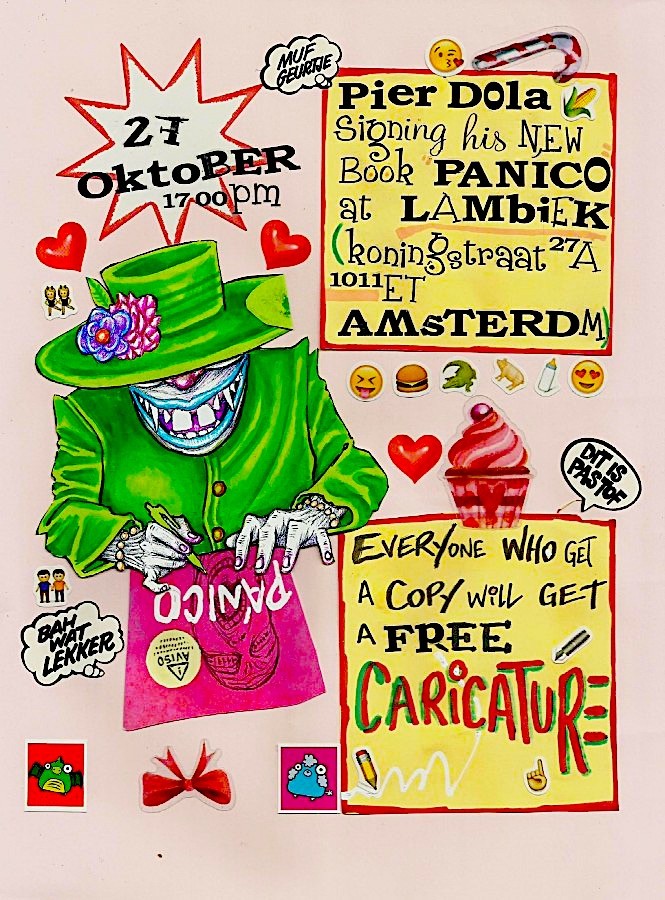 Vrijdag 27 oktober komt Pier Dola zijn nieuwste werk, Pánico, bij Lambiek signeren. Vanaf 5 uur is iedereen welkom om deze meester van comix te ontmoeten en zelfs een gratis karikatuur te krijgen met hun boek!